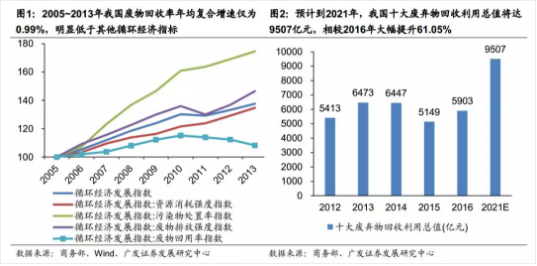 根据商务部流通业发展司和中国物资再生协会发布的《中国再生资源回收行业发展报告》,预计到2021年,我国十大废弃物回收利用总值将达9507亿元,相较2016年大幅提升61.05%。根据商务部流通业发展司和中国物资再生协会发布的《中国再生资源回收行业发展报告(2012~2016)》统计数据,2012~2016年我国十大废物五回收利用产值由5413亿元增加值5903亿元,年均复合增速仅为2.19%,其中2013~2015年连续三年出现下滑。预计到2021年,我国十大废弃物回收利用总值将达9507亿元,相较2016年大幅提升61.05%。