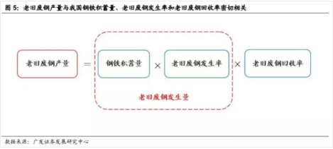 老旧废钢将成为未来国内废钢的主要来源。由于老旧废钢是指使用钢铁材料制成的各种机械设备、交通工具、农用机械、机具、建筑物铃材、军事用品、生活用品等经过一定使用年限后的报废品,因此老旧废钢产生量和钢铁蓄积量成正比,老旧废钢发生率则决定了当年老旧废钢产生量。根据前文所述,在粗钢产量和钢材消费逐步达到稳态的情况下,我国自产废钢和加工废钢产量将相对稳定,因此老旧废钢将成为未来国内废钢的主要来源。
