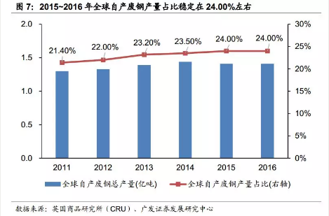 (1)自产废钢:产生量基本稳定,2015~2016年全球自产废钢产量占比在24.0%左右