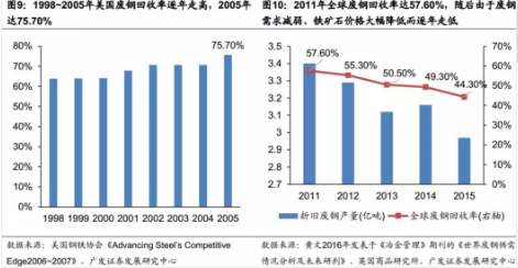 根据我们于2018年3月17日发布的《炼钢工艺发展路径专题之二:短流程发展箭在弦上?--政策、环保带来机遇,人才、技术仍有挑战,提高废钢回收率是关键前提》深度报告,2016年我国老旧废钢回收率仅为33.22%;而根据同济大学邓小华等人于2004年发表于《北方环境》期刊上的《我国与发达国家资源再生产业状况比较及分析》一文,美国废钢回收率由1980年的5.5%迅速提升至1997年的61%;而根据英国商品研究所统计数据,2011~2015年,全球折旧废钢产量由2011年的3.40亿吨降至2015年的2.97亿吨,废钢回收率也由2011年的57.6%降至2015年的44.3%。2011~2015年废钢回收率的下降的主要原因是工业发达国家废钢需求减弱,铁矿石价格走低进一步冲击废钢市场。