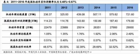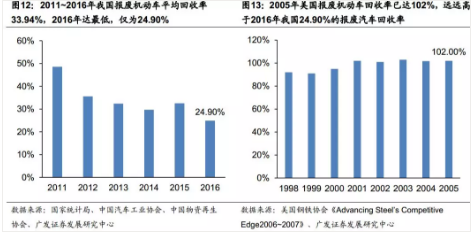 2011~2016年我国报废机动车平均回收率33.94%,仅为美国2005年水平的1/3。根据表4数据,我们可计算得到2011~2016年我国平均报废机动车回收率仅为33.94%,且呈波动下降趋势;而根据美国钢铁协会(AISI)于2007年发布的《Advancing Steel’s Competitive Edge2006~2007》报告,2005年美国报废机动车回收率已达102%,远远高于2016年我国24.90%的报废汽车回收率。