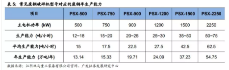 根据江阴双马重工装备有限公司官网列出的废钢破碎线型号及对应产量范围,我们可以得到主流废钢破碎线的年废钢生产能力。以PSX-1200废钢破碎线为例,其年生产能力达24.09万吨。
