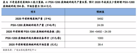 根据上文假设,2018~2020年我国需新增先进废钢加工生产能力为9492万吨,若不考虑原有废钢加工能力置换,以PSX-1200废钢破碎线年产量估算,2020年我国至少需新增PSX-1200废钢破碎线394条;以PSX-1200废钢破碎线及其他辅助设备造价1000万元/条计算,2020年前新增废钢破碎线市场容量39.4亿元。