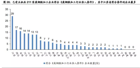 截止2018年3月28日,已有五批共211家废钢铁加工企业符合《废钢铁加工行业准入条件》。江苏省符合条件的废钢铁加工企业达29家,湖北、安徽、河北、山东、江西和河南省符合条件的废钢铁加工企业也均超过了10家。
